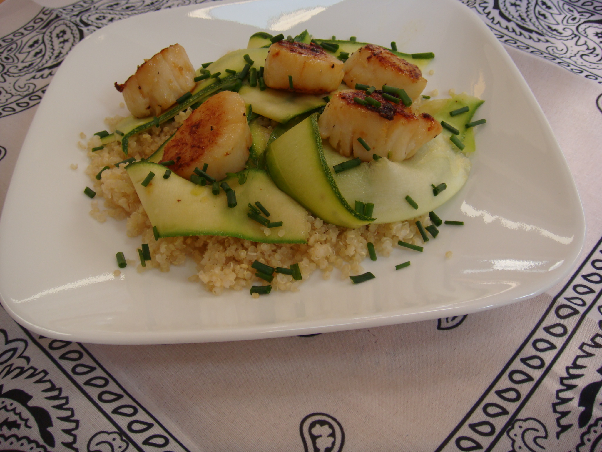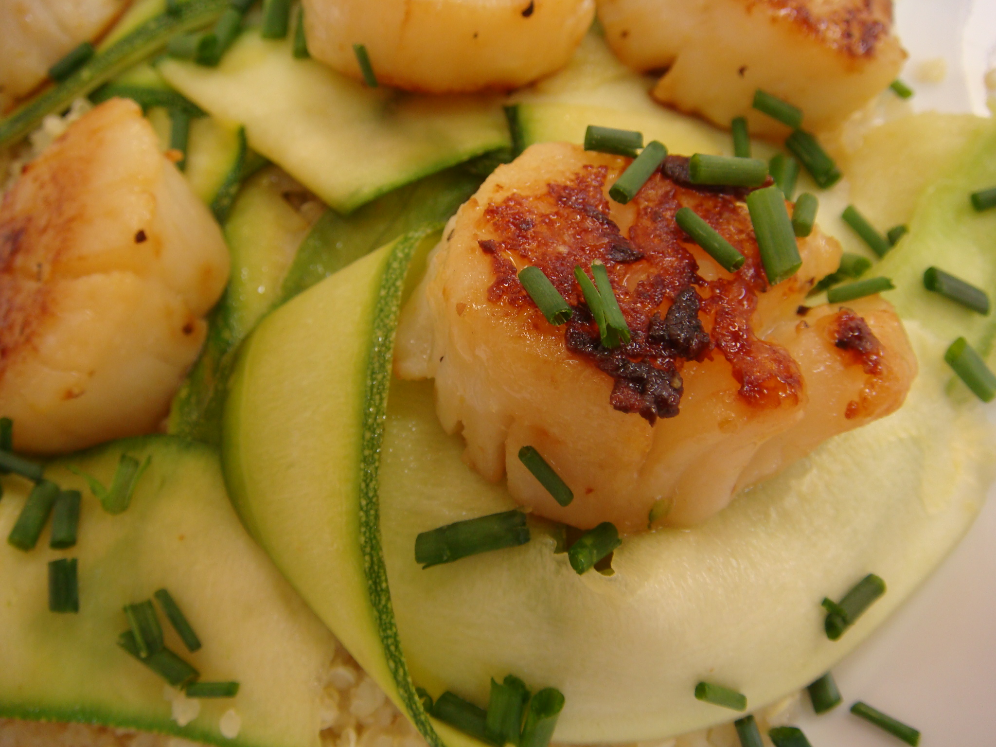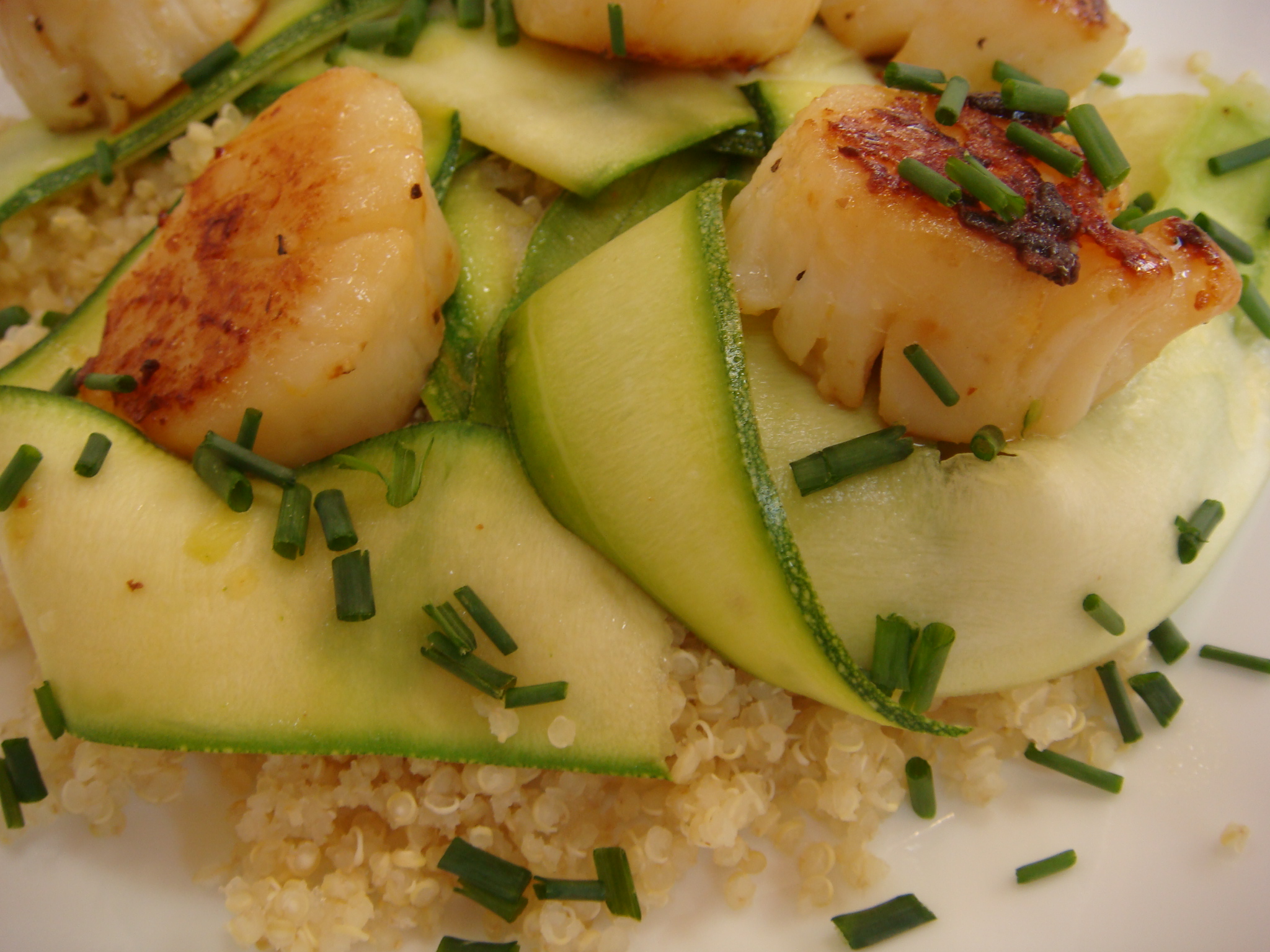 Spoon quinoa onto each plate and then top with zucchini ribbons. Place several scallops on top and sprinkle with fresh chives.